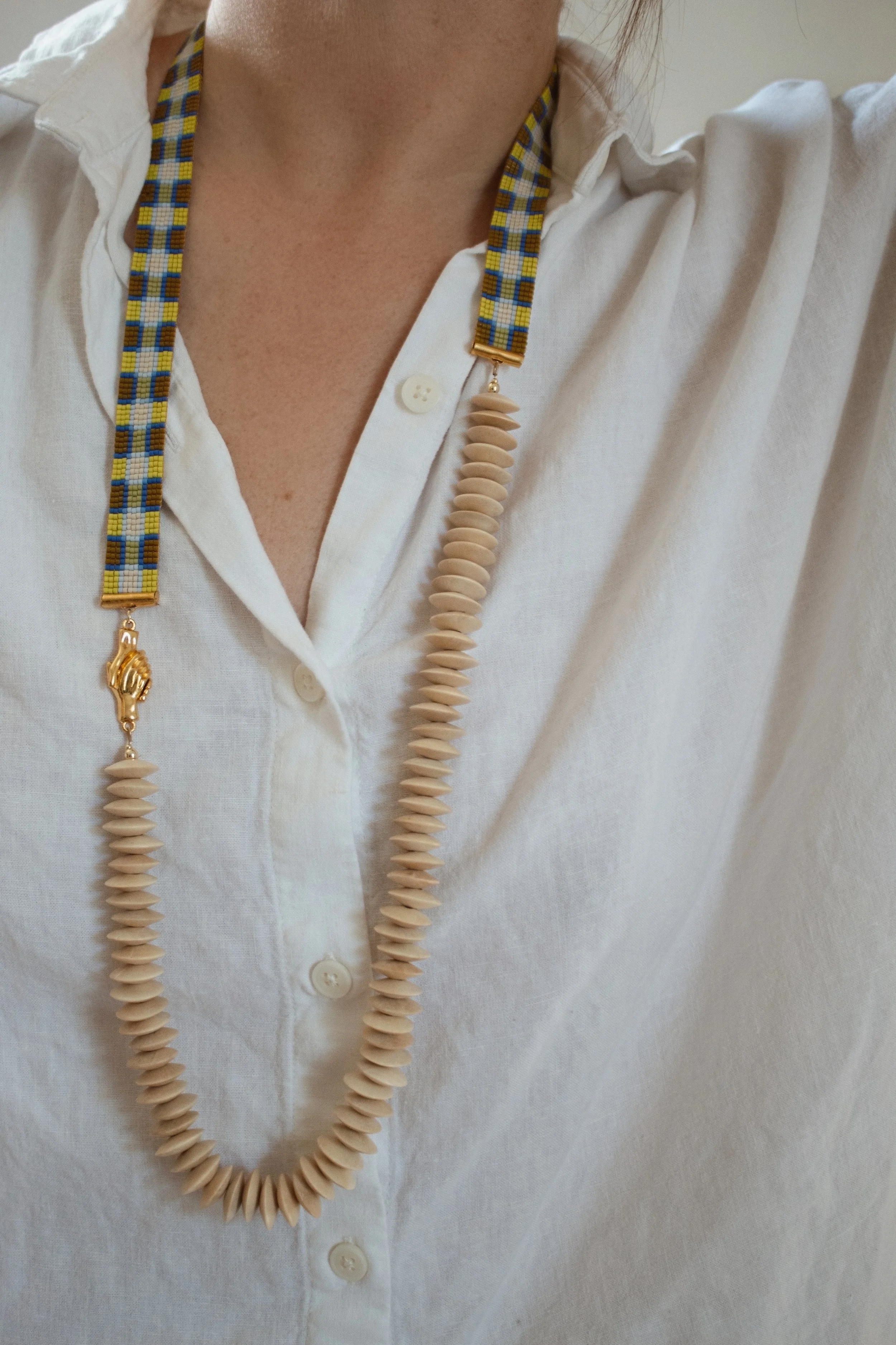 A playful pairing of precision and personality—handwoven Miyuki glass seed beads meet smooth natural wood discs in this modern mix of texture and tone. Finished with a fun and functional 24K gold-plated magnetic handshake clasp.